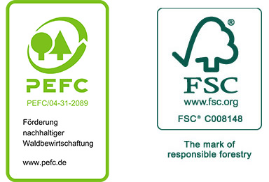 FSC® und PEFC zertifizierte Ware bieten wir Ihnen gerne auf Anfrage an.